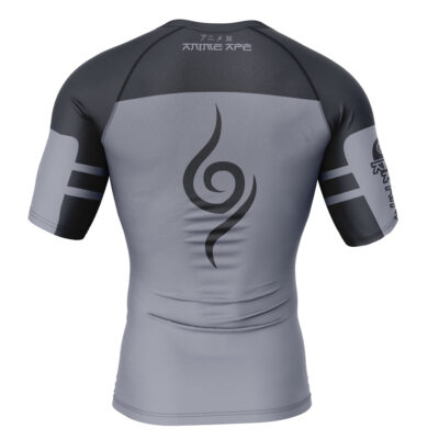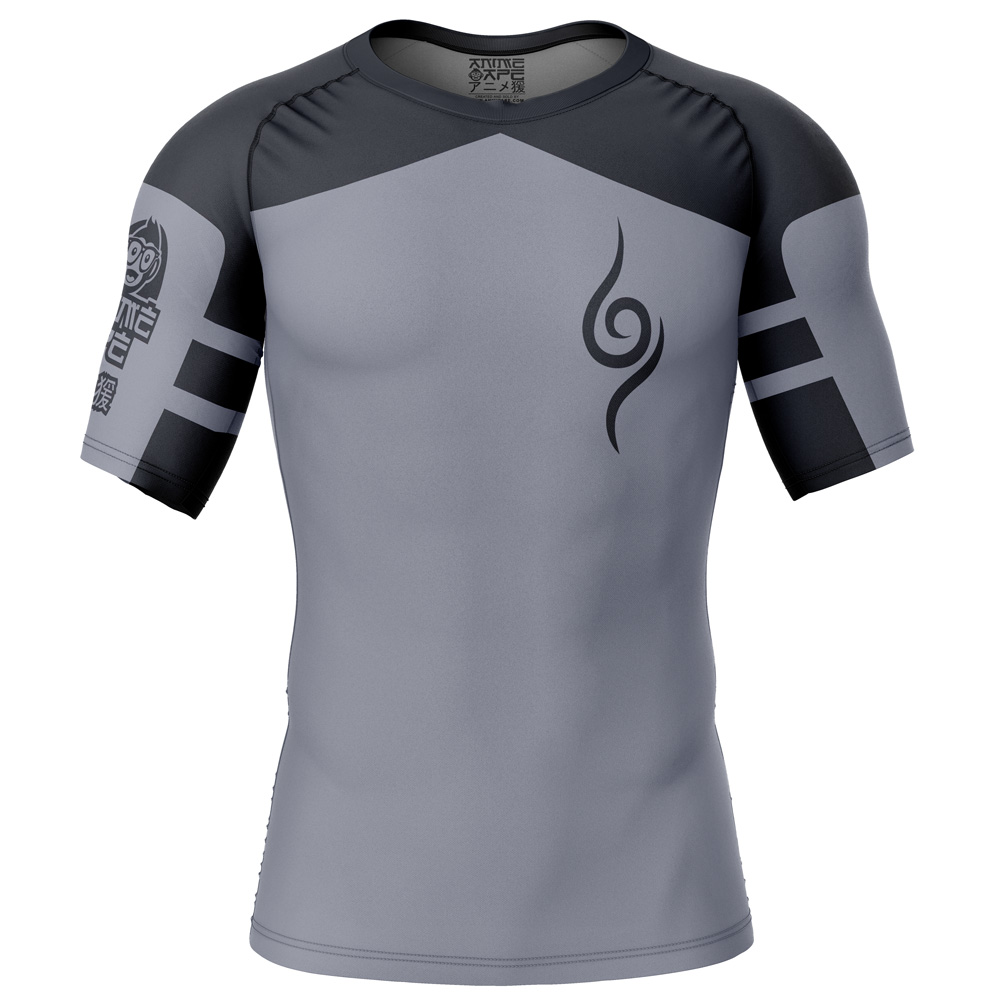 The Kakashi Anbu Shippuden Short Sleeve Rash Guard Compression Shirt features a gray design with black shoulder accents, tribal-style graphics on the chest and sleeve, and two bold black stripes on each arm. + Kakashi Anbu Shippuden 2-in-1 Performance Shorts + Kakashi Anbu Shippuden BJJ MMA Fight Shorts + Waterbenders Avatar Gym Shorts